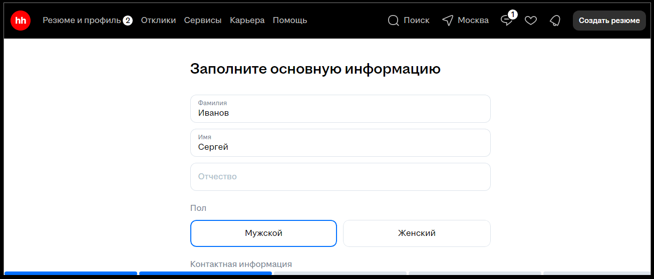 Встроенный редактор резюме внутри платформы hh.ru с фиксированной структурой. Она уже адаптирована под требования работодателей и алгоритмы платформы Доступен один формат в виде анкеты, где нужно последовательно заполнить все разделы. После ее заполнения резюме можно сразу публиковать в базе, отправлять по ссылке или скачивать.