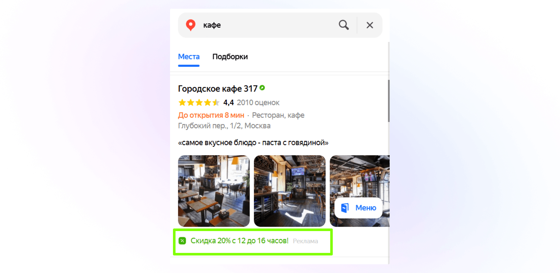 Скидки работают всегда! А если они сразу видны на Яндекс.Картах — шанс, что выберут именно вас, резко возрастает. Добавьте акции и подарочные сертификаты в профиль компании: это выделит вас среди конкурентов и сразу даст повод клиенту кликнуть именно на вашу карточку.