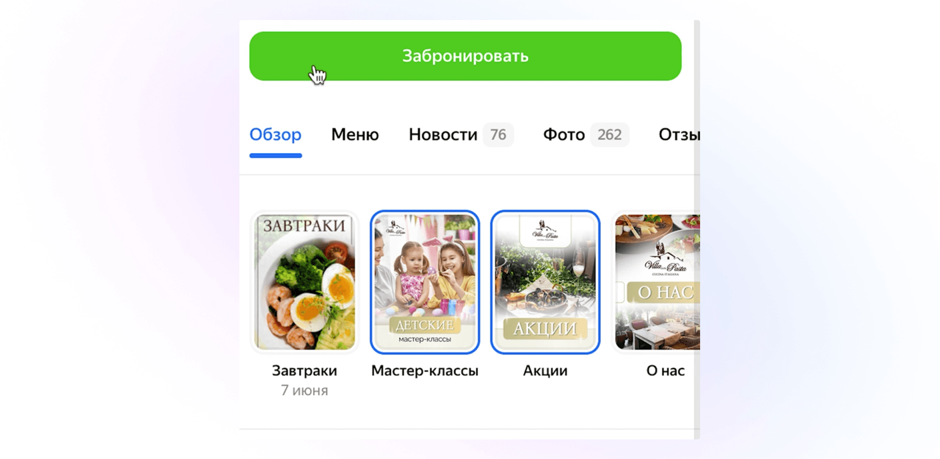 Добавляйте яркие блюда, стильные стрижки, готовые квартиры после ремонта — все, что визуально «продает» ваш продукт. А если добавить кнопку со ссылкой — например, на меню, прайс или форму записи — клиенту не придется лишний раз искать информацию: он сразу может посмотреть цену и записаться.