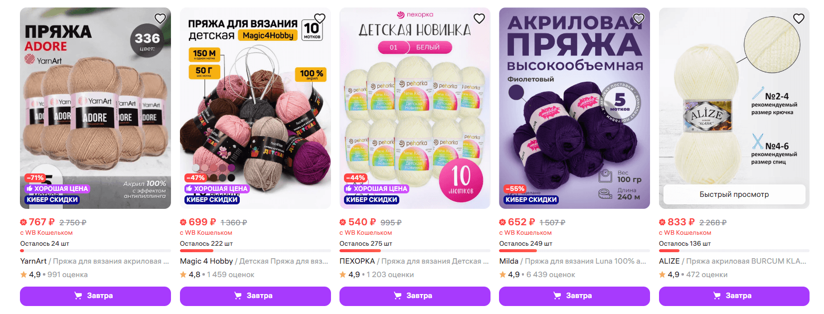 На маркетплейсах покупатели ищут не креатив, а информацию. К примеру, если женщина хочет купить пряжу, она ищет четкое фото мотков, код и название цвета, метраж и состав, а не эстетичную раскладку всего швейного ассортимента с чашкой кофе и книгой в кадре.