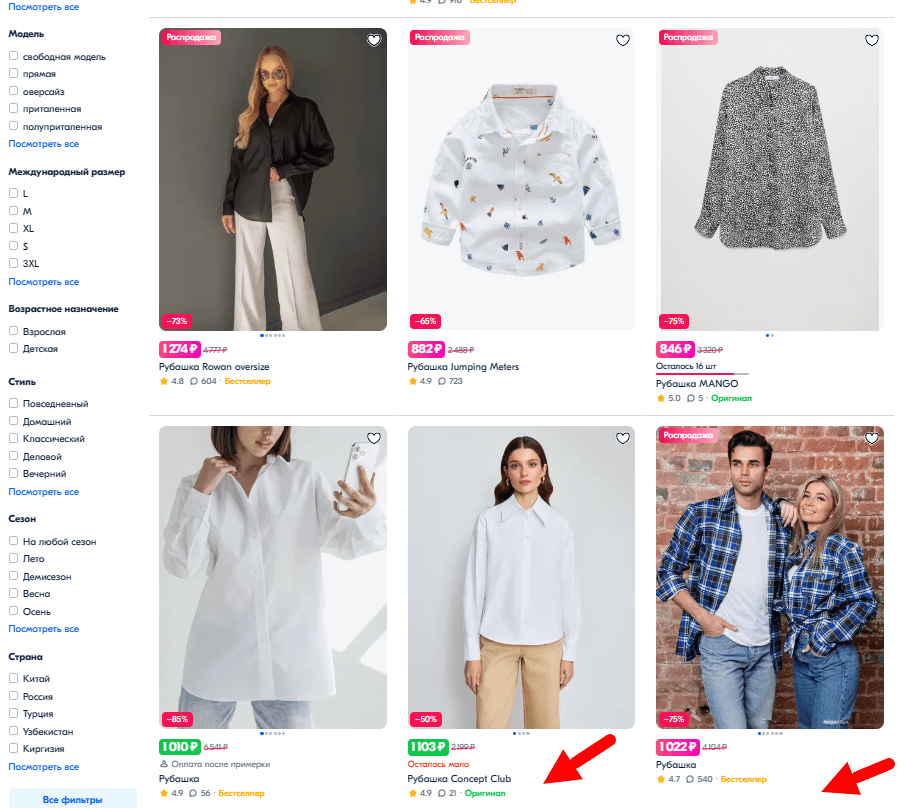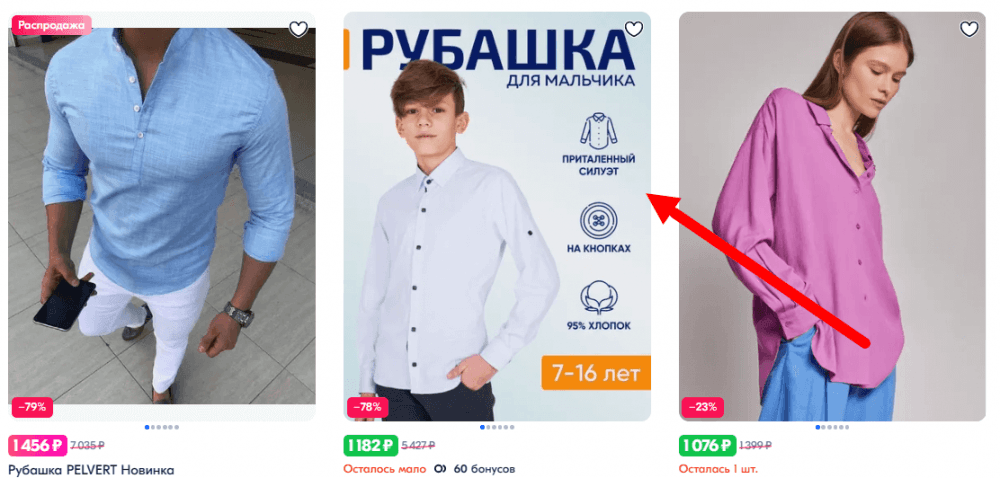 Покупатель может узнать покрой, состав и другие характеристики рубашки не заходя в карточку — это повышает конверсию