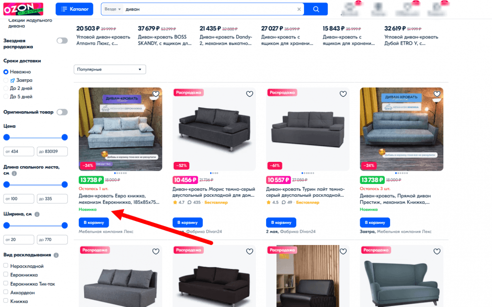Новинка на первом месте выдачи по запросу «диван»