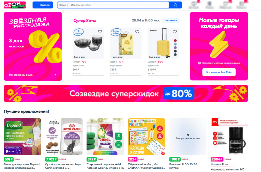 Главная страница маркетплейса Ozon: все эти товары с оплаченной рекламой