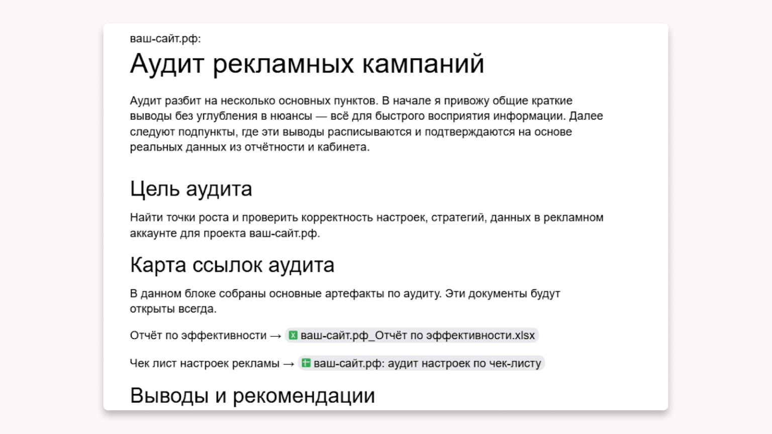Составлен на примере аудита рекламных кампаний в Яндекс Директе, который я делаю на основе отчётности и данных из рекламы.