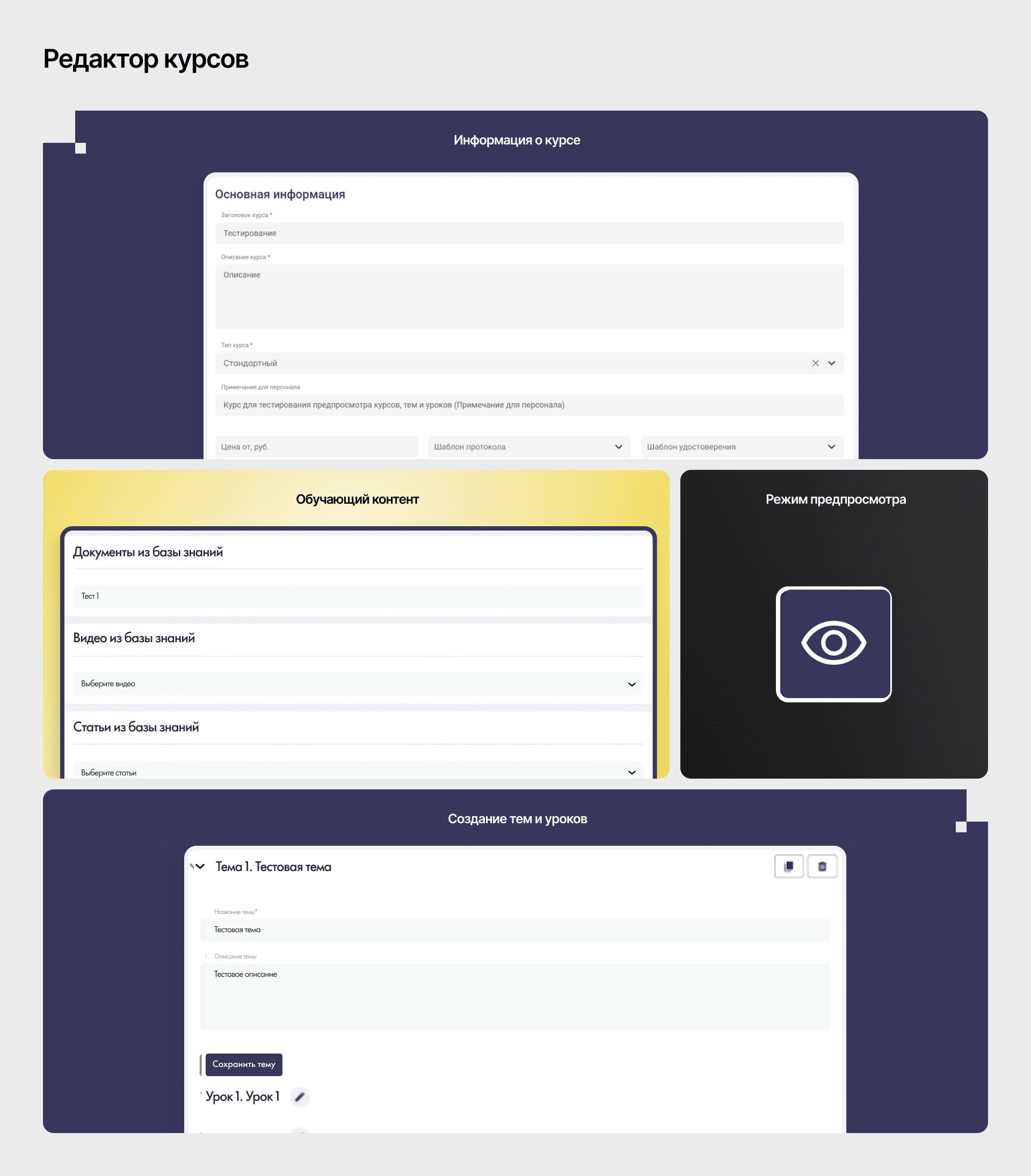 Встройте гибкий редактор курсов. Он должен позволять структурировать контент по темам, модулям и урокам. А также добавлять текст, видео, тесты, документы и даже интерактивные элементы без лишних барьеров. Обязателен предпросмотр, чтобы избежать ошибок до публикации.