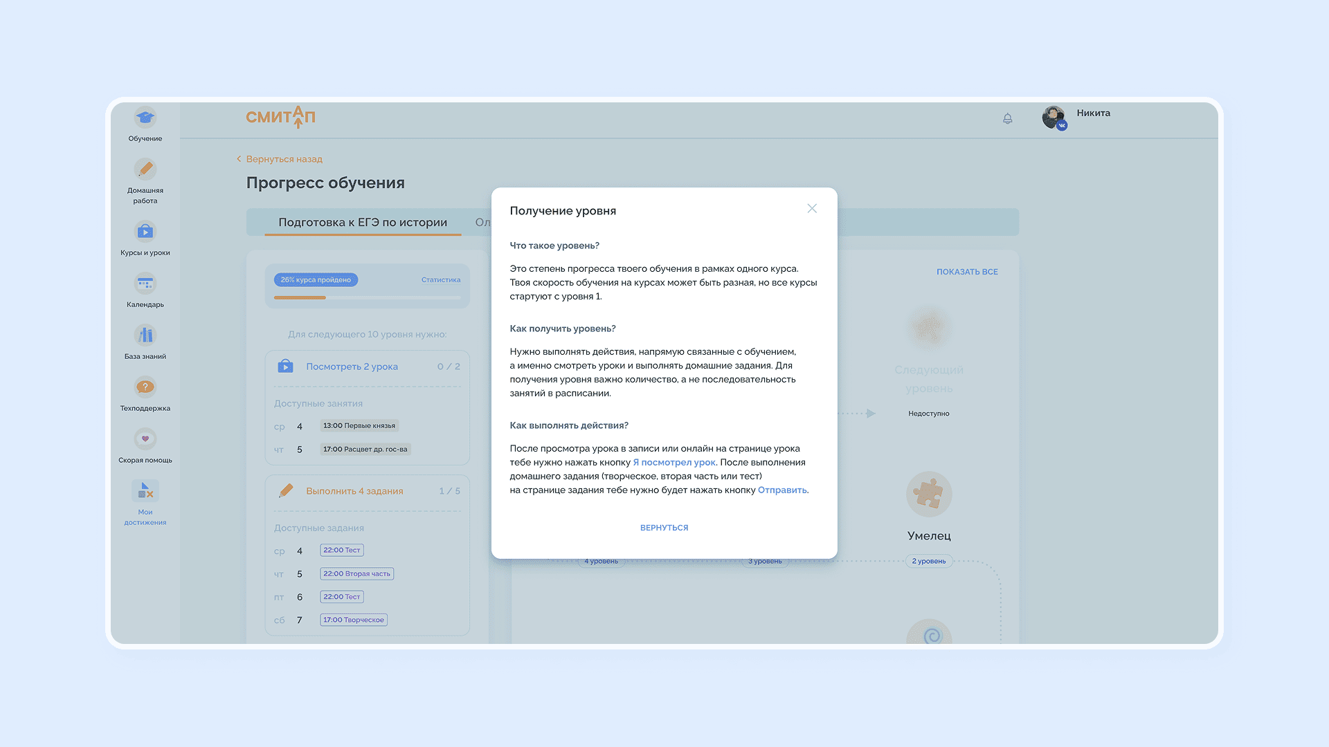 При внедрении геймификации на платформе «СМИТАП» мы добавили онбординг, чтобы студенты могли познакомиться с системой прогресса и ачивок.