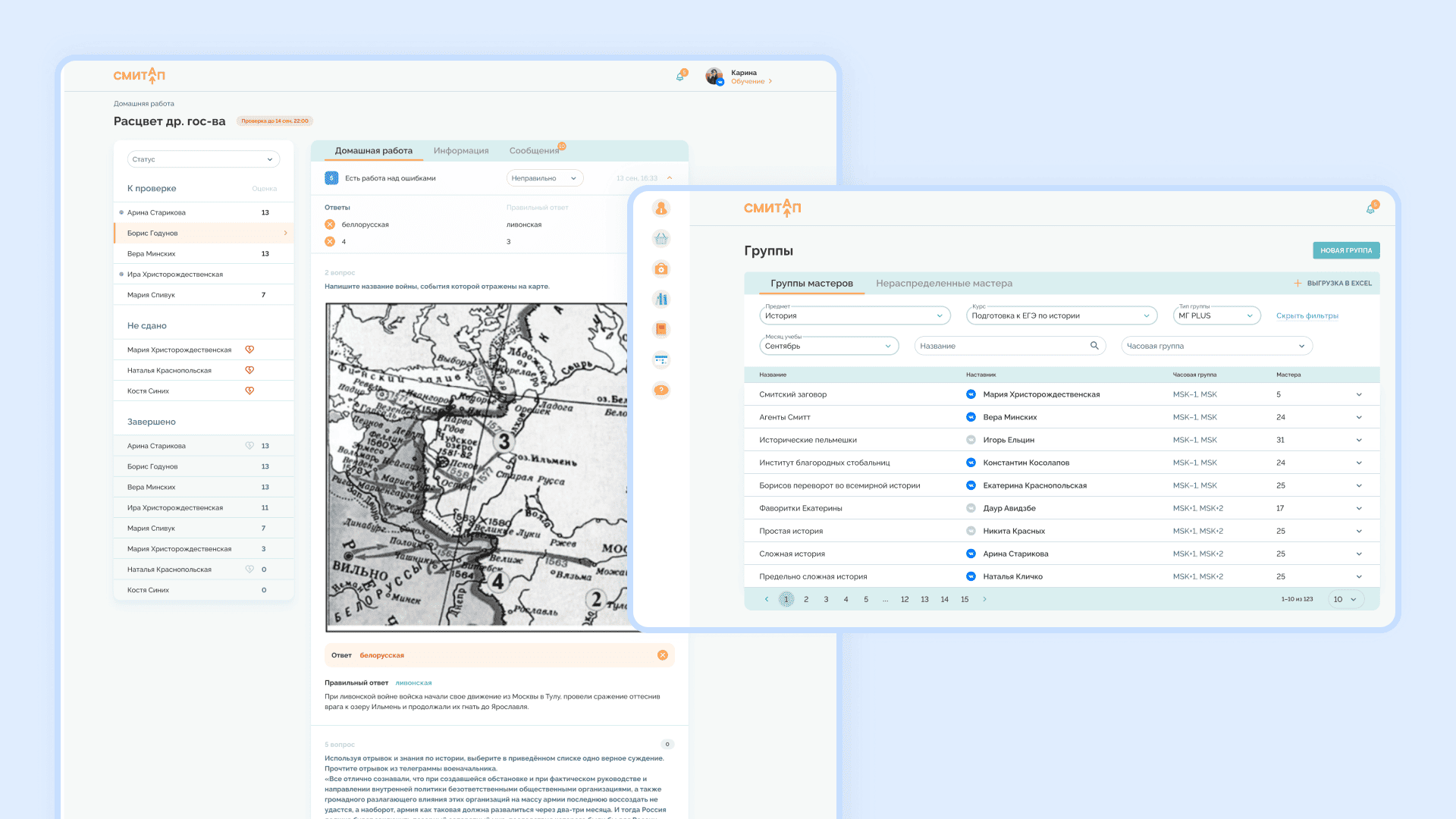 Для онлайн-школы «СМИТАП» мы внедрили автоматическую проверку тестов, распределение учеников по группам с учетом часовых поясов и формирование отчетов.