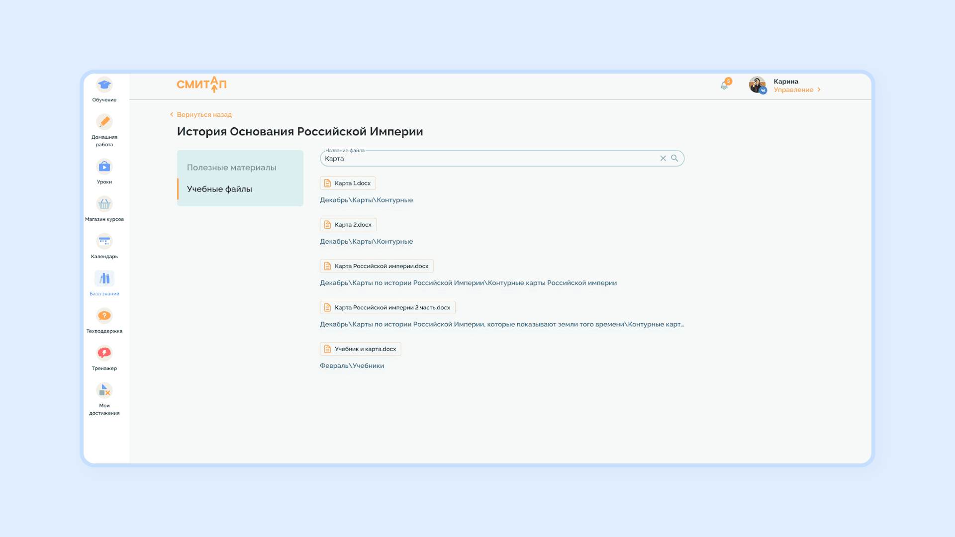 На платформе «СМИТАП» также есть раздел для добавления полезных материалов, учебников и методичек. Преподаватель может быстро найти документ через строку поиска и прикрепить его к уроку или заданию.