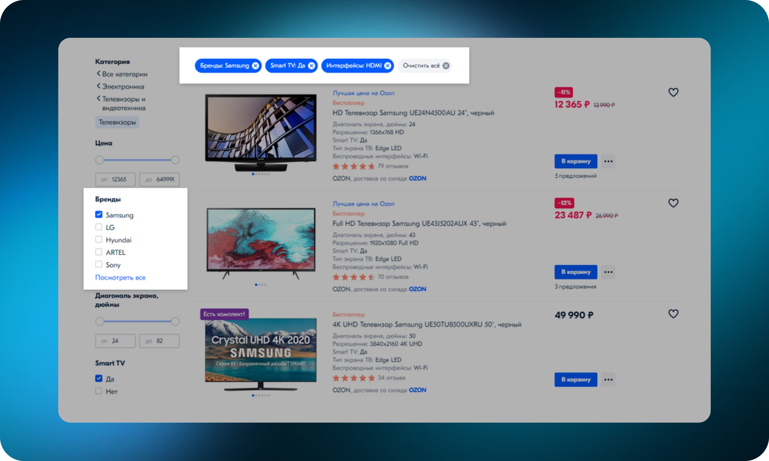 Так пользователю будет понятно, на основании чего сделана выборка. Ему не придётся выискивать проставленные галочки в фильтре, чтобы удалить их. Достаточно будет удалить их над выдачей. К примеру, если среди прочих свойств телевизоров пользователь выбрал телевизор определенного бренда и не нашел подходящие товары, он может сразу удалить бренд из списка параметров и получить выборку со всеми брендами.