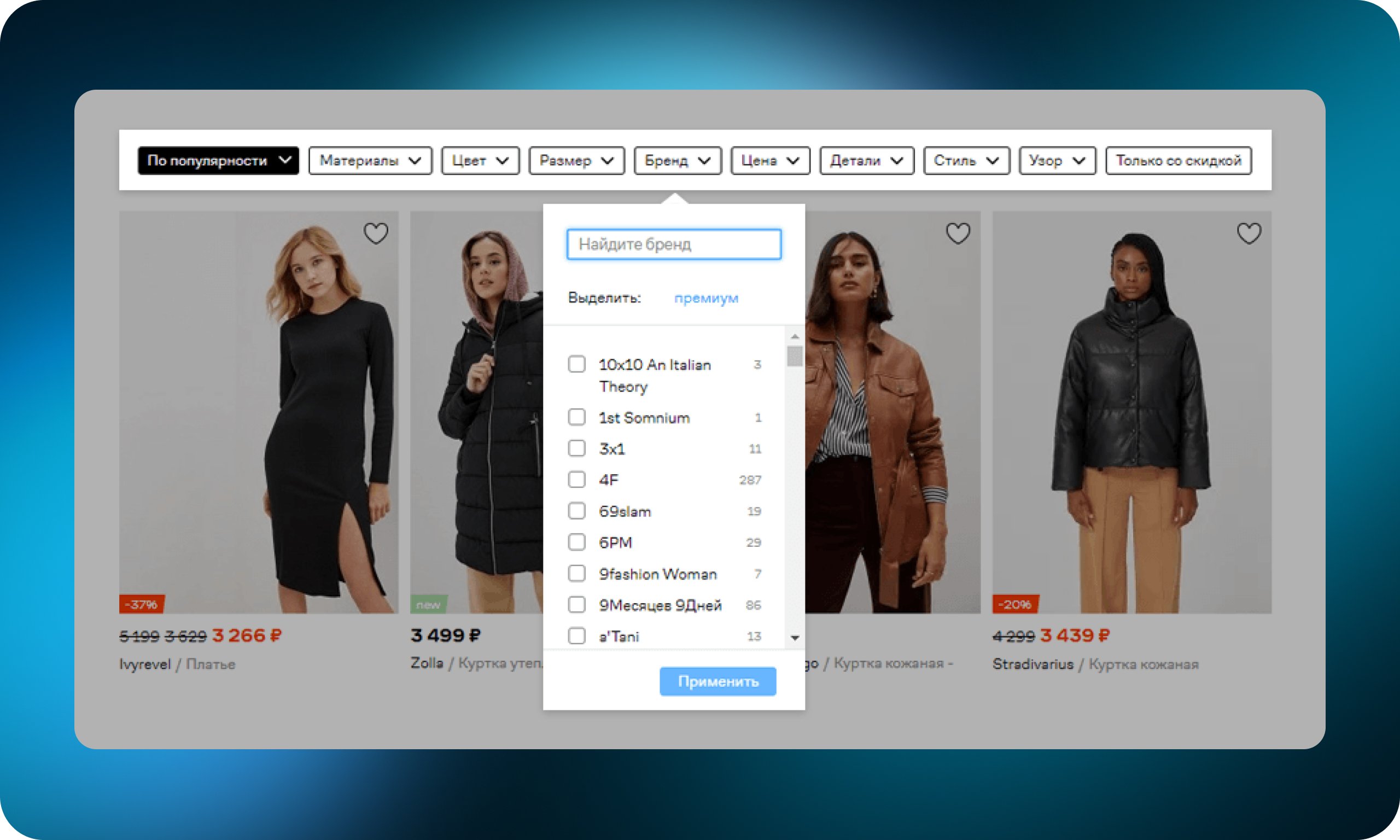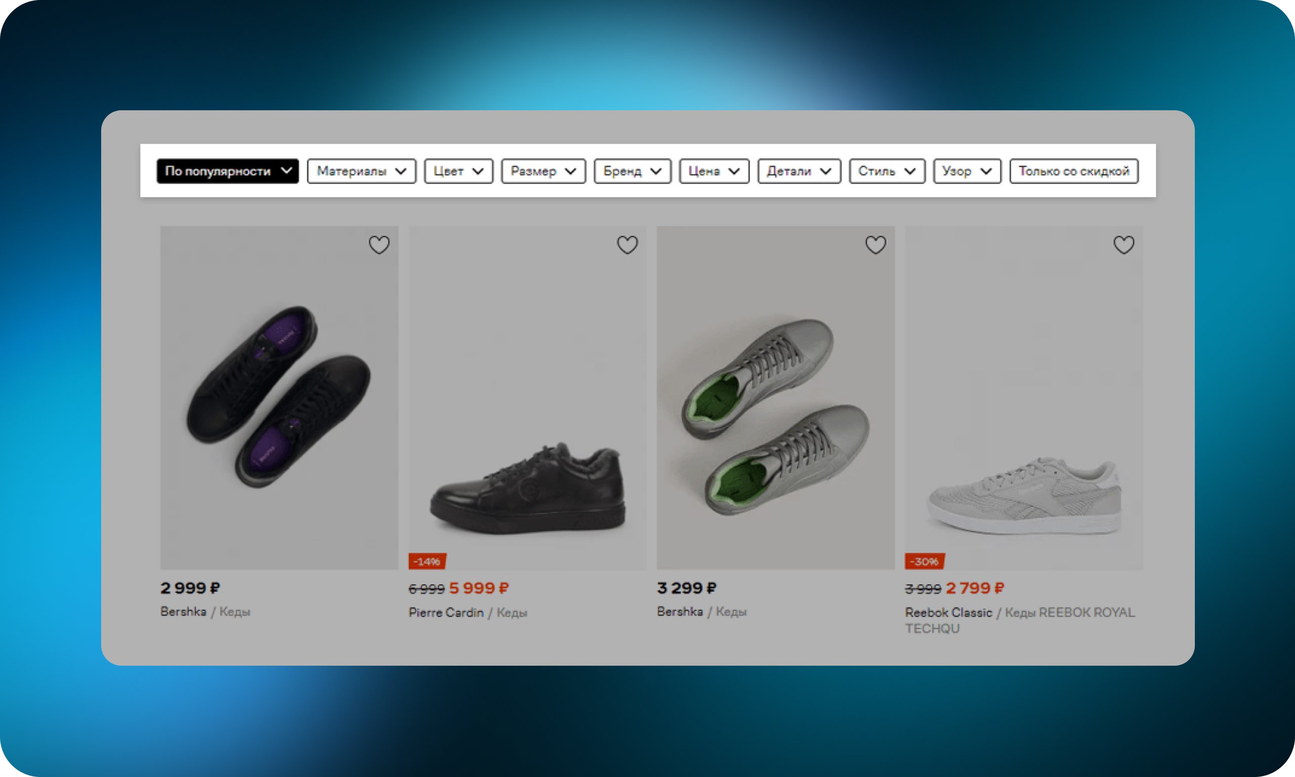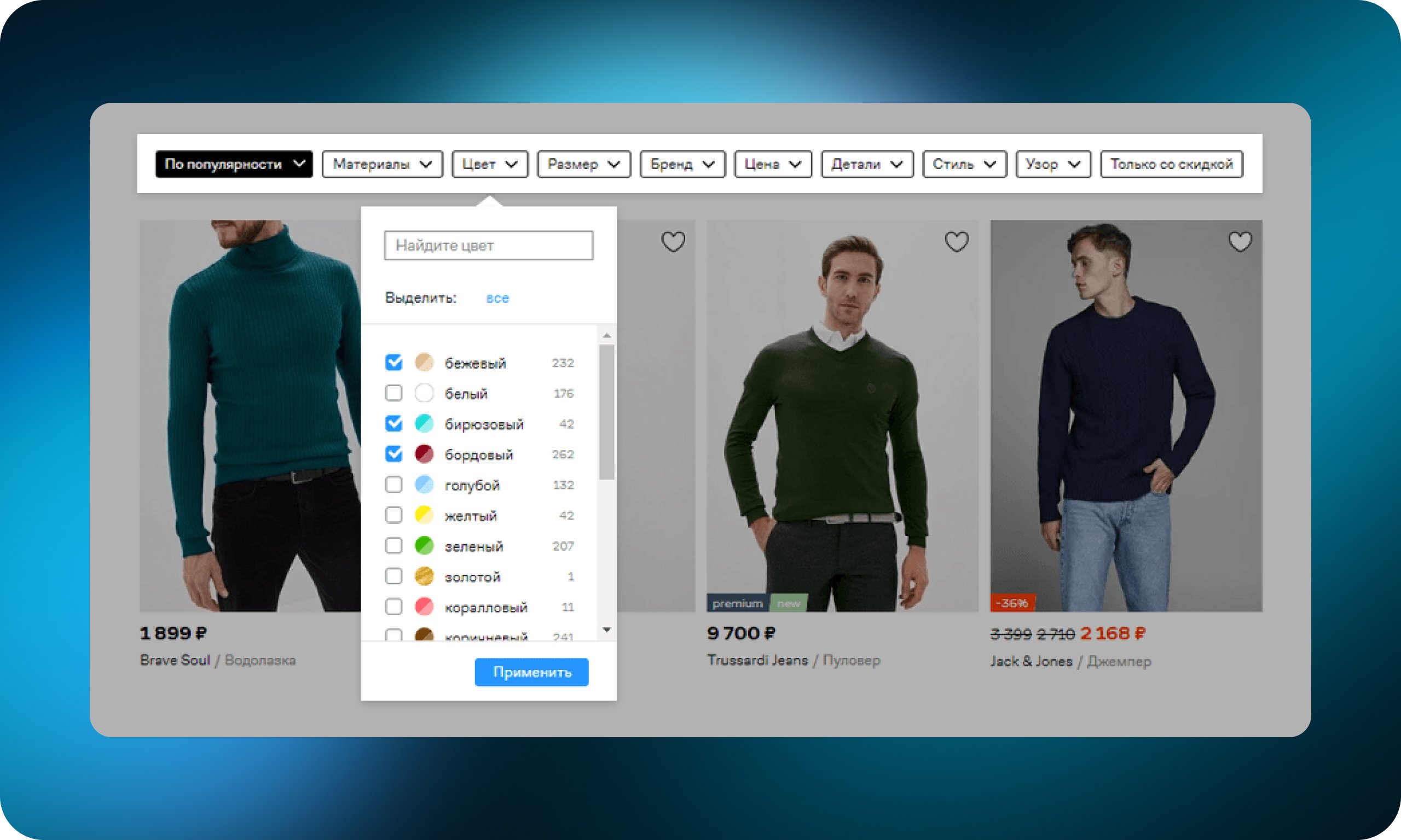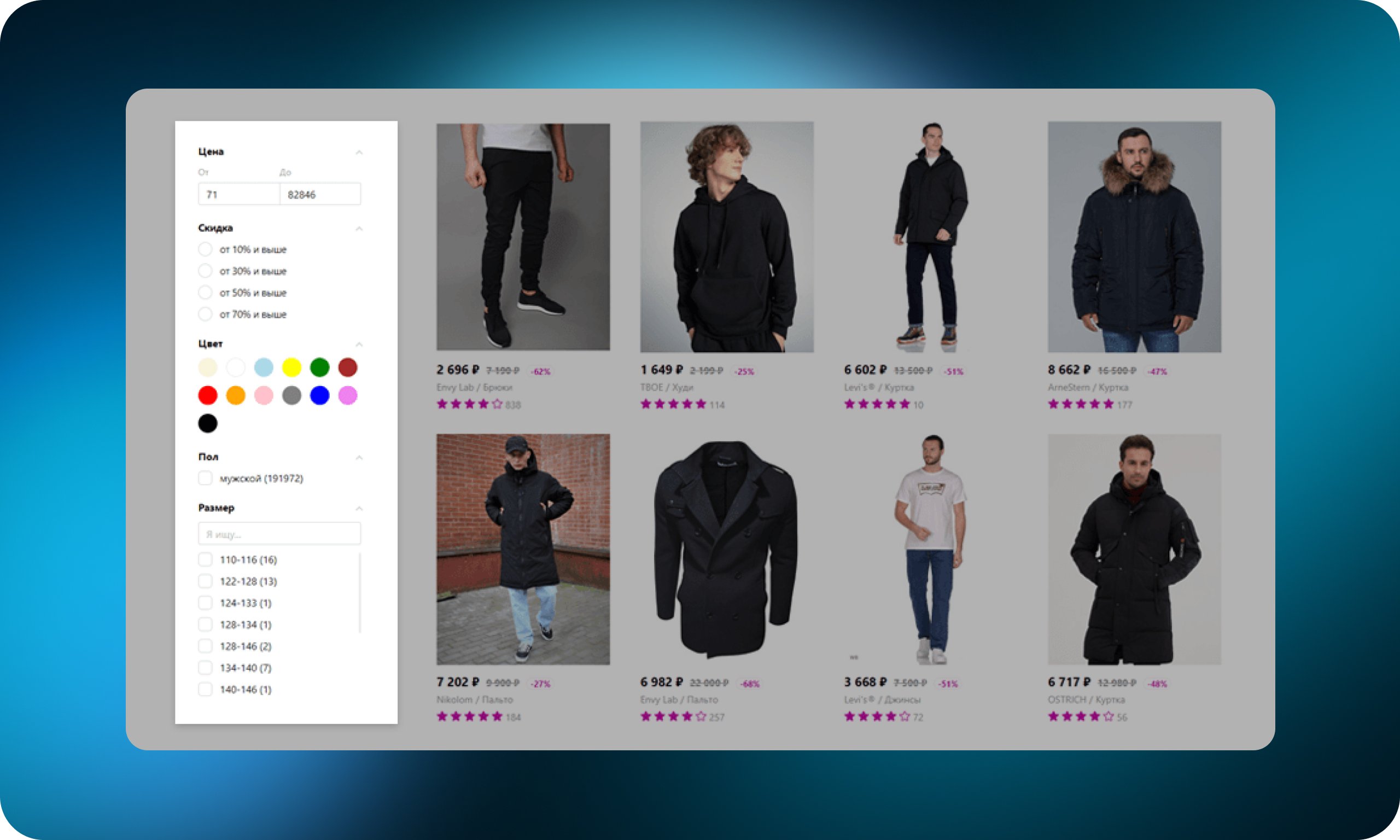 Фильтрация товаров — возможность сузить ассортимент до выборки с характеристиками, наиболее релевантными индивидуальным потребностям пользователя. Такими характеристиками может быть цена, размер, бренд или другой важный для пользователя параметр. Фильтры помогают быстрее найти нужный товар и в какой-то мере заменяют продавца-консультанта. Обычно располагаются в сайдбаре.
