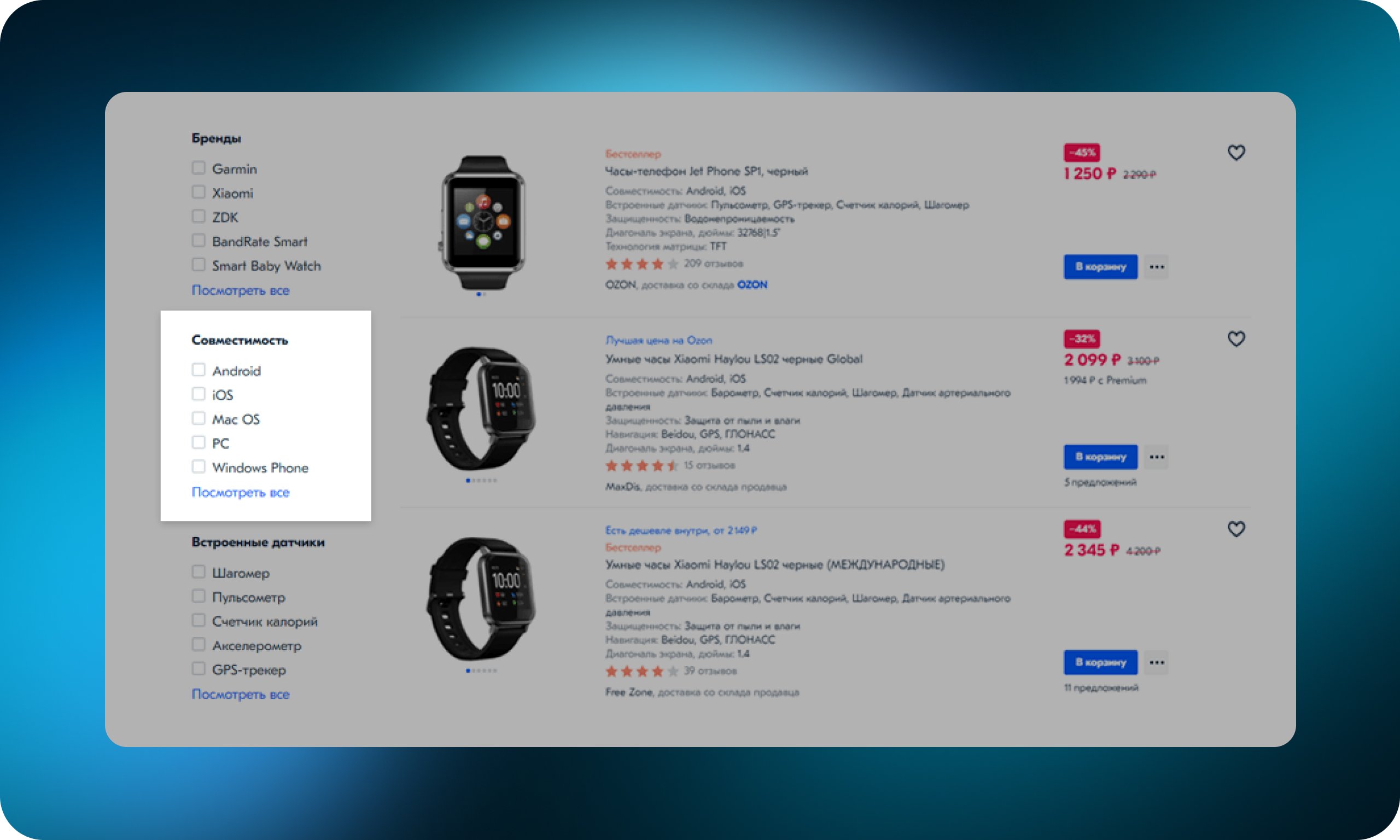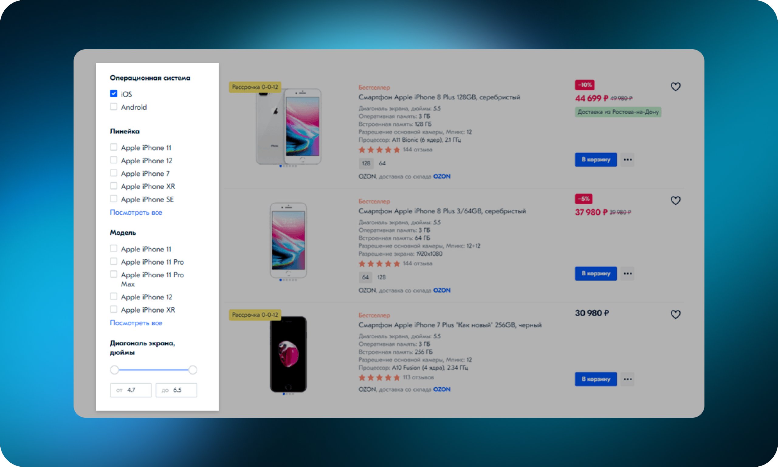 При выборе операционной системы iOS на ozon.ru несовместимые с системой параметры перестают отображаться — остаются только подходящие линейки и модели, которые попадут в отфильтрованный список товаров.