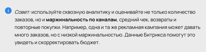 Битрикс интегрируется с Яндекс.Метрикой и другими системами сквозной аналитики, позволяя видеть полную картину: от клика на рекламное объявление до завершённого заказа. Это помогает понять, какие каналы маркетинга приносят больше прибыли, а какие работают неэффективно.