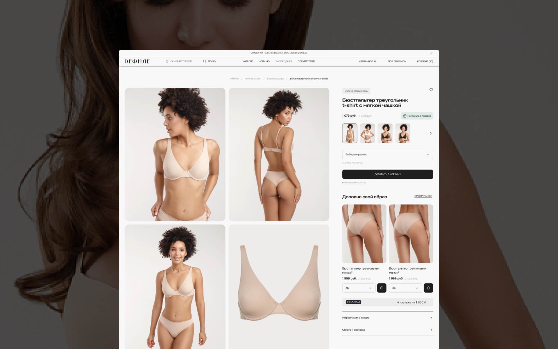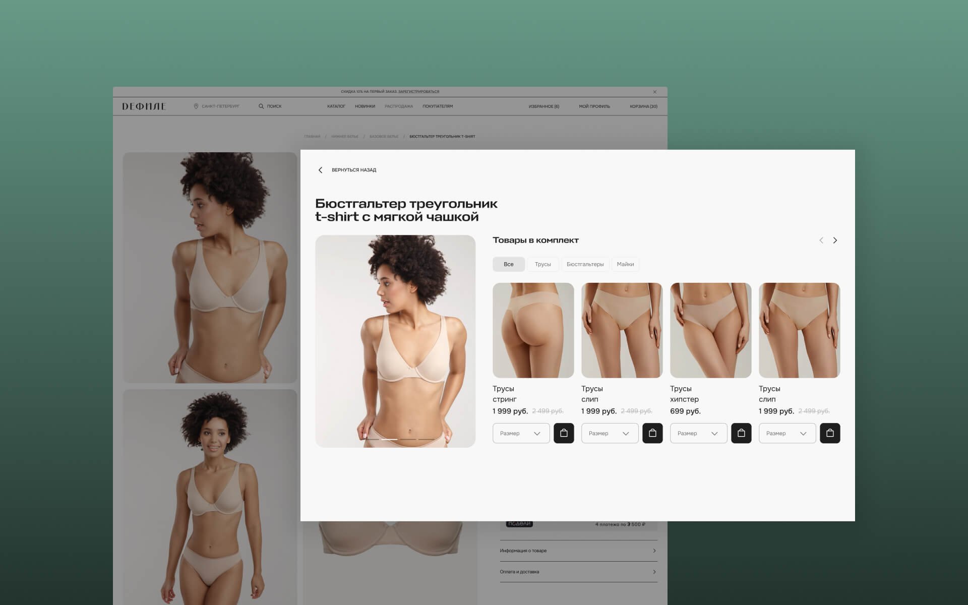 В карточке товара мы реализовали возможность не просто выбора подходящих товаров, а визуального объединения их в комплект. Пользователь видит, как предметы из набора выглядят вместе, что помогает представить будущий образ и увеличить конверсию.