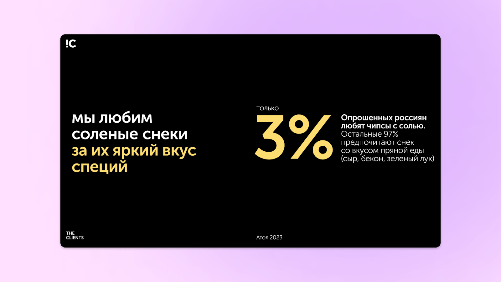 А ещё исследование АТОЛ от 2023 года подтверждает нашу мысль: люди чаще выбирают интересные и насыщенные вкусы, и только 3% опрошенных любят чипсы просто с солью. Большинство топит за сметану и зелень, вкус краба, сыр… Короче, за яркий и интенсивный вкус — источник таких же вкусовых впечатлений.