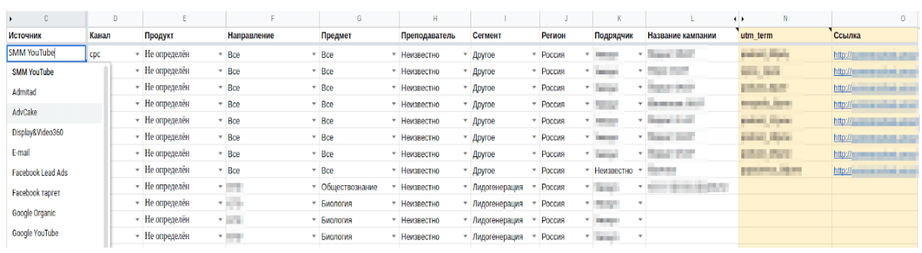 Как мы решили проблему. Со всеми агентствами договорились о единых наименованиях для рекламных кампаний и метрик. Для удобства ввели конструктор для создания UTM-меток — таблицу в Google Sheets, где для создания тега нужно заполнить обязательные поля. Главное преимущество конструктора в том, что выбор параметров возможен только из закрепленного списка. Такой подход позволяет избежать ошибок ручного ввода данных.