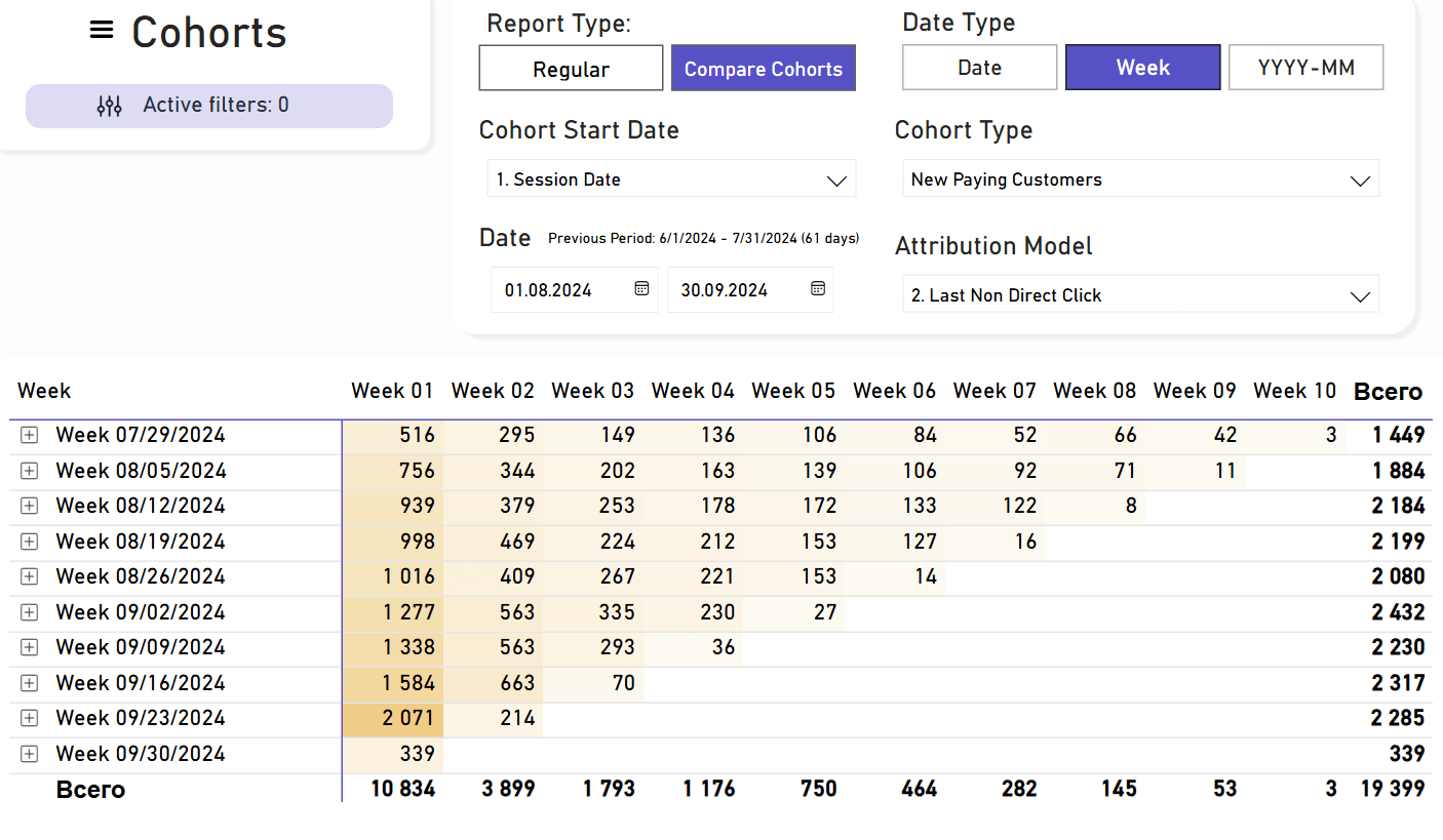 Мы автоматизировали сбор аналитики — отчетность обновляется раз в сутки. Так компания может оперативнее оценивать эффективность каналов продвижения. Ежемесячный анализ данных заменили когортным — по отдельным группам аудитории. Например, можно посмотреть, что делали клиенты, которые пришли из email-рассылки или через контекстную рекламу. Когортный анализ помогает лучше прогнозировать доход от покупателей, потому что подсвечивает схожее поведение пользователей внутри группы.