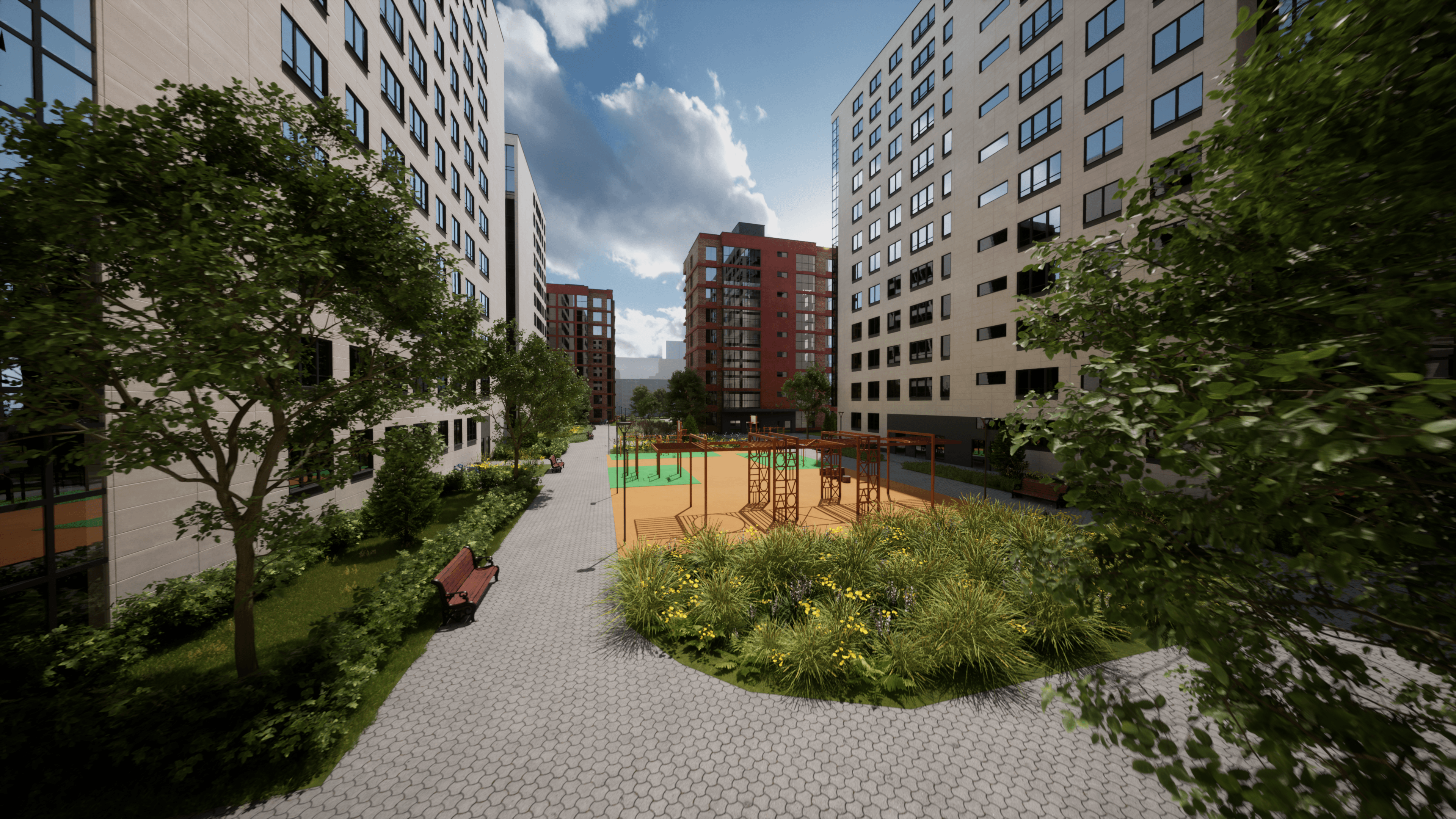 Именно эти механизмы задействует 3D‑визуализация ЖК. Вместо цифр, планировок и схем, сложных для восприятия, покупатель видит новый квартал. Здесь уже всё готово! Озеленение, детские площадки, спортивные зоны. Во дворе бегают дети и прогуливаются мамочки с колясками. Стоят припаркованные машины, а солнце светит дружелюбно и ласково. Всё это – эффект присутствия. Клиент легко может представить себя в этом месте, оценить удобство двора, близость магазинов и остановок.