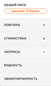 Создан для анализа качества SEO-текстов. Оценивается риск попасть под санкции «Баден-Бадена» – поискового алгоритма определения текстового спама.Общий риск обозначается в баллах: