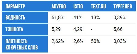Чтобы наглядно продемонстрировать это, мы провели семантический анализ нашего текста с помощью Advego.com, Istio.com, Text.ru и «Тургенева»: