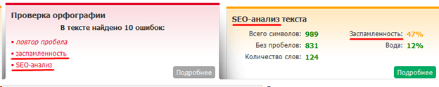 Для полноценного SEO-анализа слишком мало данных, а в орфографическом словаре не хватает многих слов. Яркое подтверждение – на иллюстрации: лексемы «заспамленность», «SEO-анализ» сервис выделил как ошибки, хотя сам их использует.