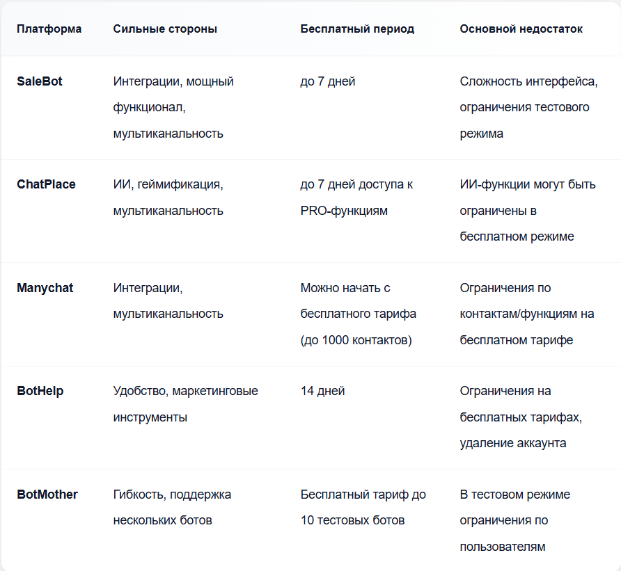 Если вам нужно быстро протестировать идею и поработать с небольшой аудиторией, подойдут конструкторы с длительным пробным тарифом, например, ChatPlace или BotHelp.