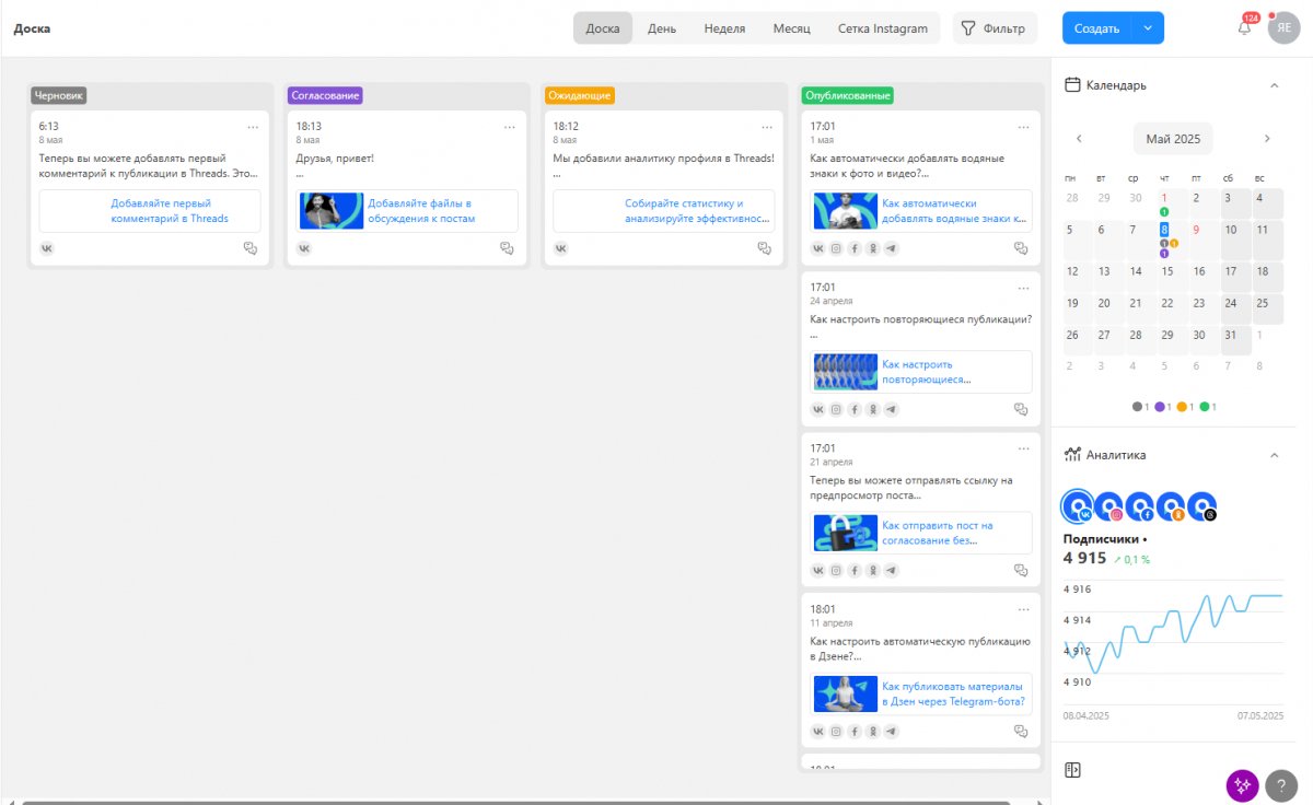 Омниканальность — тренд 2025 года. Необходимость постоянного присутствия в нескольких соцсетях требует значительных временных затрат на рутинные операции: подготовку, планирование и публикацию контента, что снижает эффективность. Чтобы охватывать несколько платформ, нужна система планирования публикаций. PostMyPost – инструмент для комплексного управления публикациями: позволяет планировать контент в визуальном календаре, автоматически публиковать его в заданное время на различных площадках, а также предоставляет аналитику по вовлеченности и эффективности.