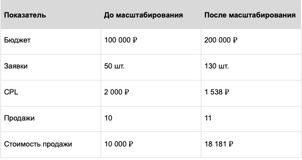 Что получилось в реальности: заявок стало в 2,6 раза больше, а продаж — всего на одну. Бюджет вырос вдвое, стоимость реальной продажи — тоже, потому что масштабировалось не то.