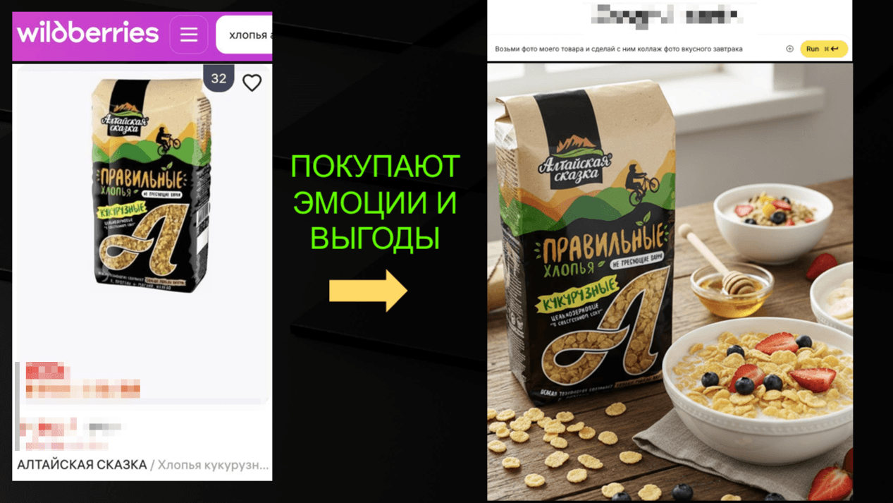 Покупатель хочет видеть не картонную коробку. Он хочет видеть изменение в своей жизни после покупки. В задании нужно просить визуализировать результат использования товара. Это вызывает аппетит и желание обладать вещью. Простая фотография упаковки работает намного хуже.