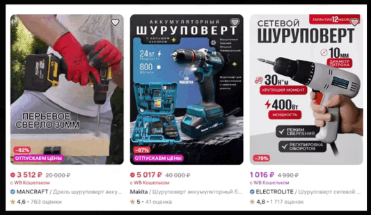 В категории шуруповертов большинство продавцов показывают инструмент просто на белом фоне. Если вы сделаете так же, то будете конкурировать только ценой. Поставьте задачу показать товар в кейсе.