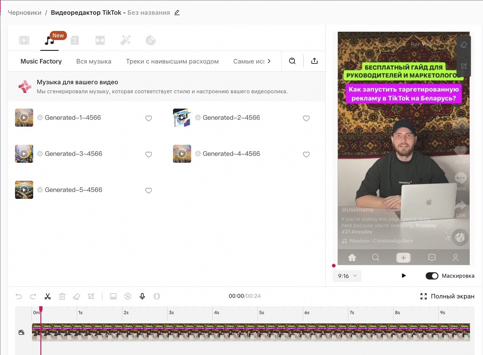 5. Есть возможность редактировать видео сразу внутри рекламной платформы — удобная функция, позволяющая добавлять текст, музыку, обрезать видео и тд.