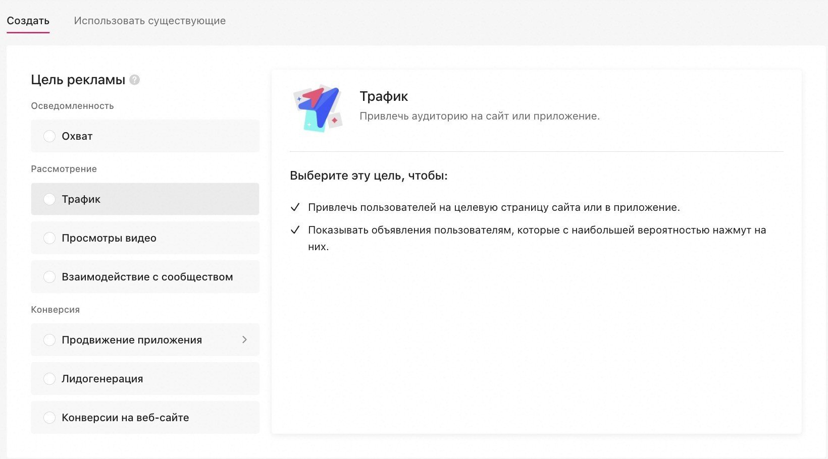 4. В рекламном кабинете TikTok представлен широкий спектр рекламных целей, таких как: конверсии, лиды, клики и тд. Каждая из целей имеет хорошую оптимизацию. Соответственно, есть варианты для тестирования разных механик и поиска рабочей связки.