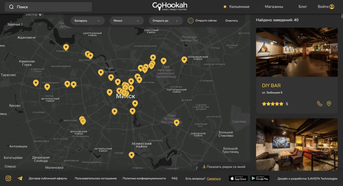 Весной 2020 года к нам обратились ребята из индустрии и предложили запустить сервис для поиска кальянных. Они готовы были взять на себя продвижение и связь с заведениями, а на нас была техническая реализация сервиса. Так и получился проект.