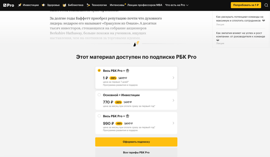Похожая механика монетизации — у российского СМИ «РБК Pro». Все материалы здесь платные. Но «РБК Pro» — это по сути сервис с доступом к профессиональному контенту, к которому относятся не только статьи, но и онлайн-мероприятия: вебинары и трансляции. Плюс, в подписку могут входить встречи Клуба инвесторов. В то время как основное СМИ — «РБК» — всё же не требует подписки.
