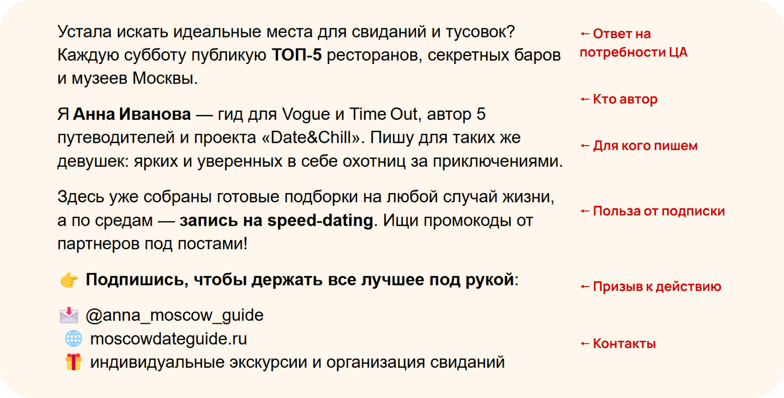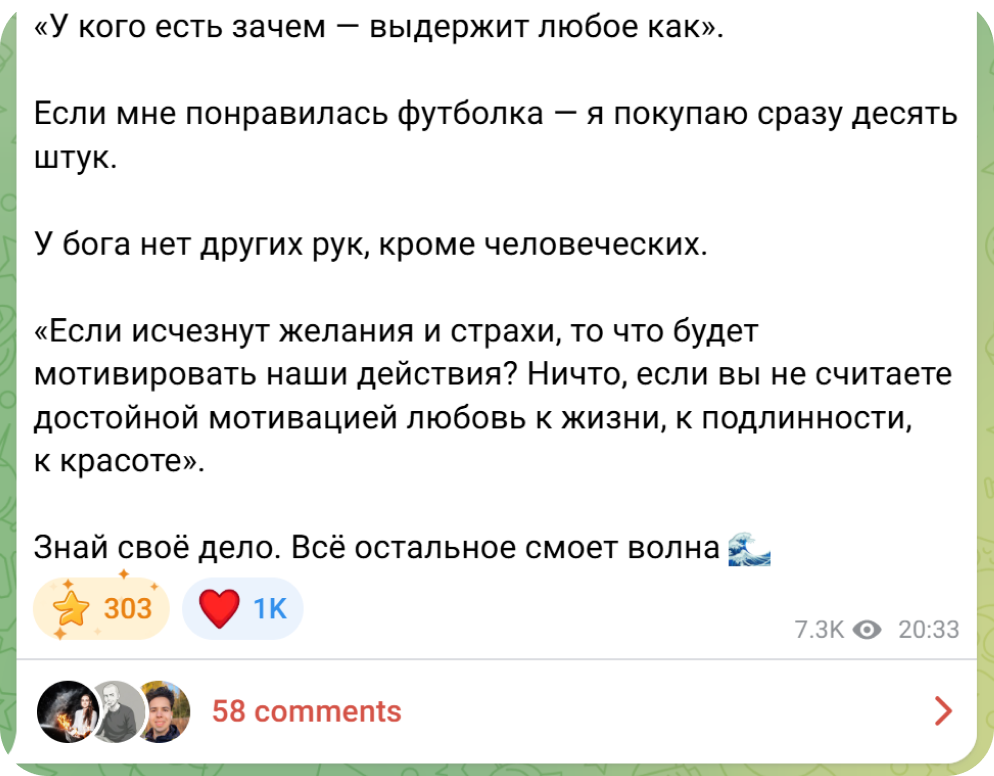 Только помните о соблюдении баланса между пользой для аудитории и продажами. Читатель едва узнал о канале. Если вы не уверены на 100% в его намерениях, лучше вместо продажи познакомить с услугами, компетенциями и конкретными ситуациями, в которых вы будете полезны.