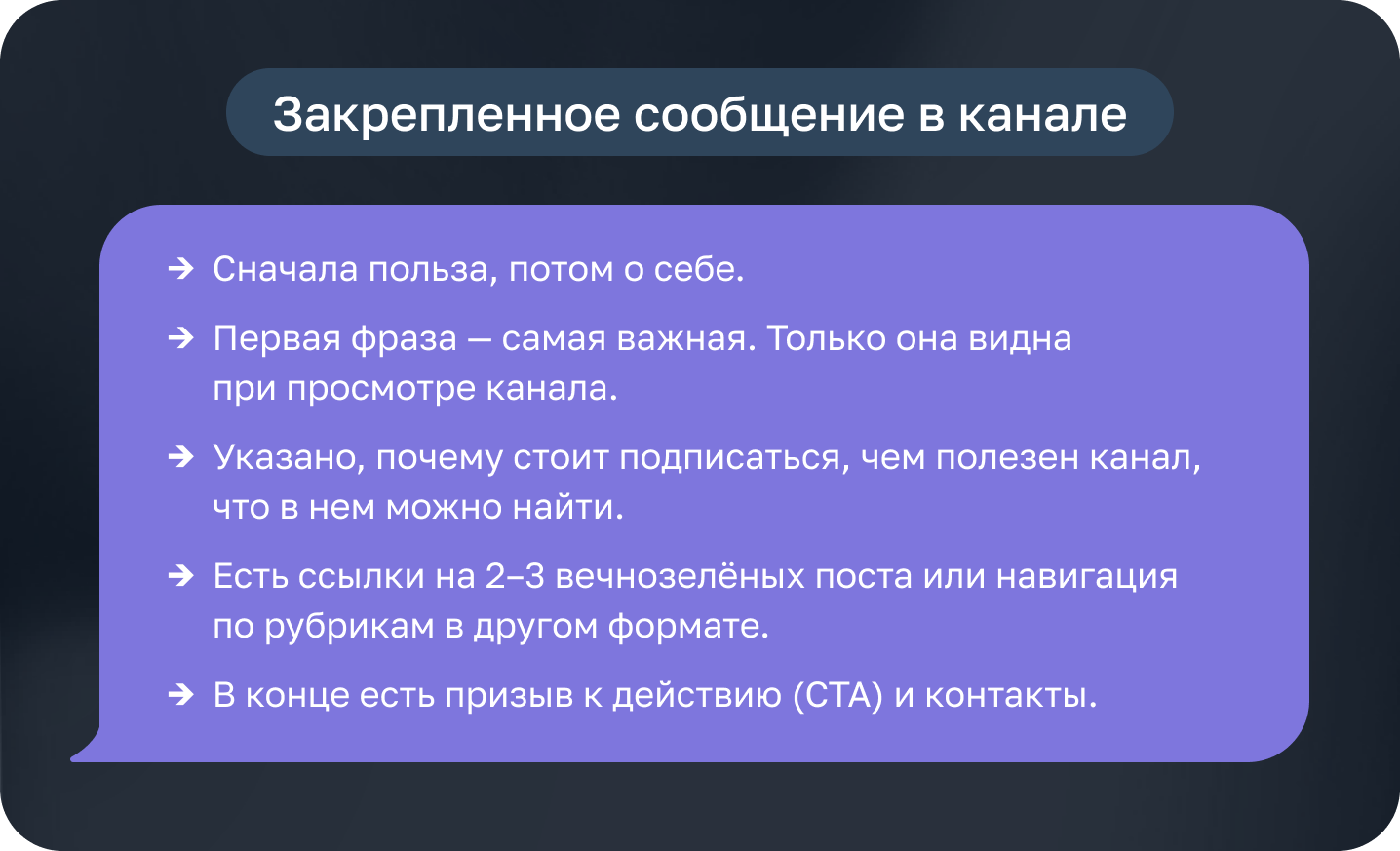 Закреп — это важный элемент канала. Часто его содержание напрямую влияет на подписки и отписки, а также на то, насколько удобно читателям ориентироваться в вашем контенте. Я собрала все рекомендации в короткий чек-лист, чтобы вам было проще проверить закрепленные сообщения и ничего не упустить: