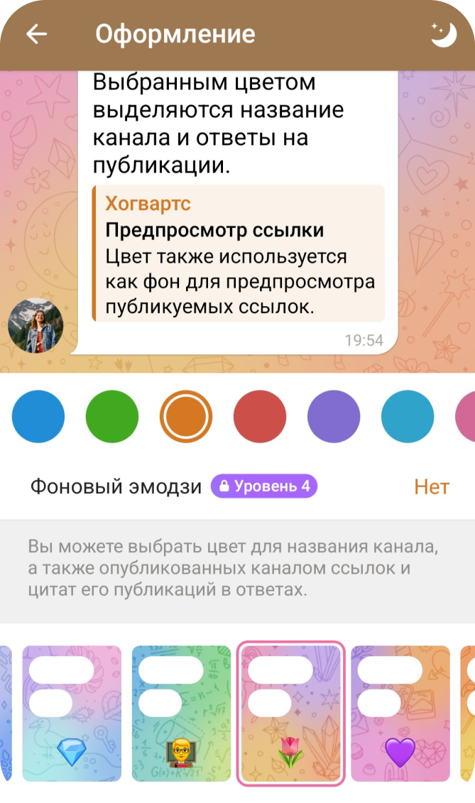 Это инструмент персонализации, который помогает выделиться и сделать ресурс более узнаваемым. Вы можете настроить Телеграм-канал под себя или под определенную тематику. На площадке есть готовые фоны или возможность загрузить свой собственный — в виде файлов JPEG или PNG.
