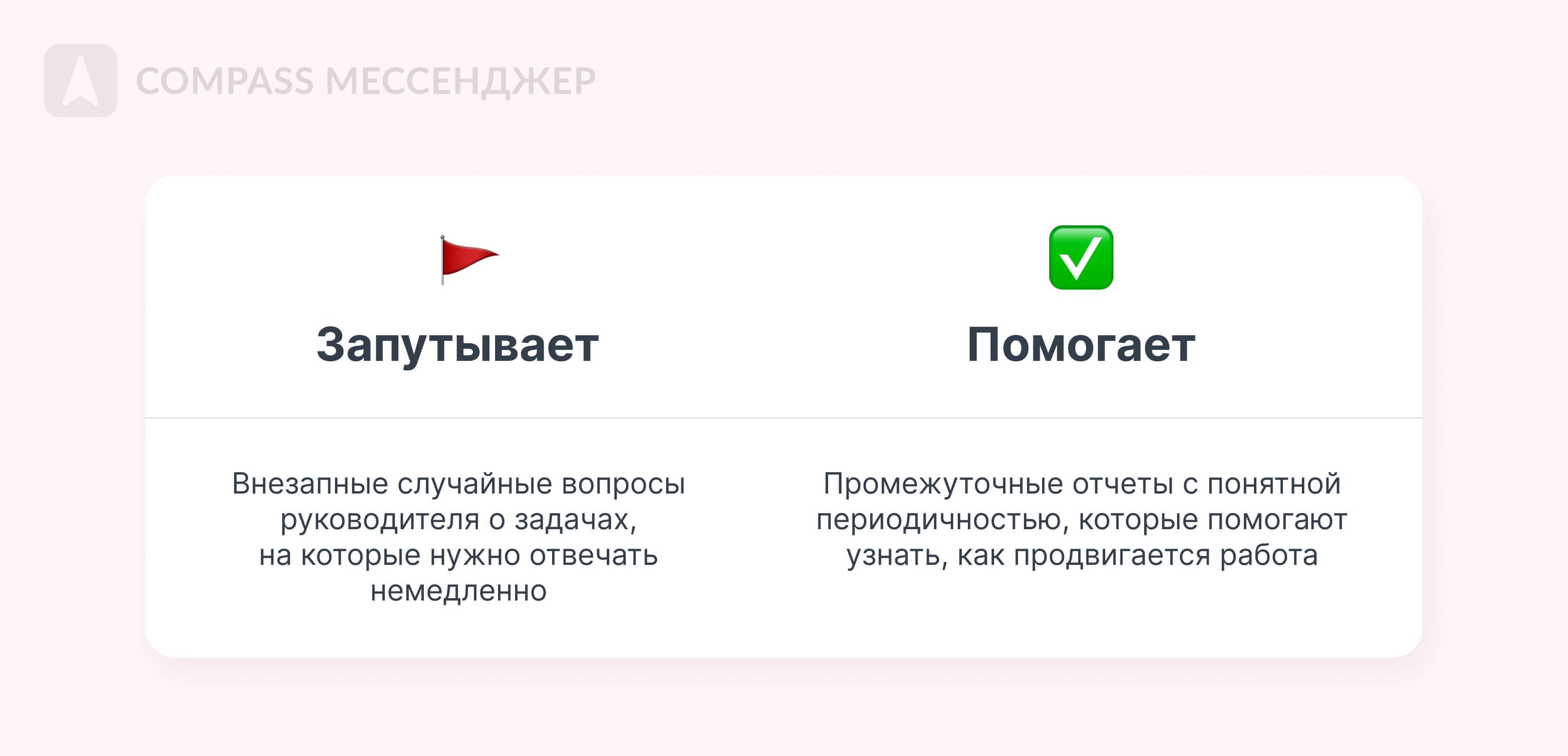 😇 В здоровой команде руководитель доверяет специалистам, получает промежуточные отчёты и остаётся вовлечённым без излишнего контроля.