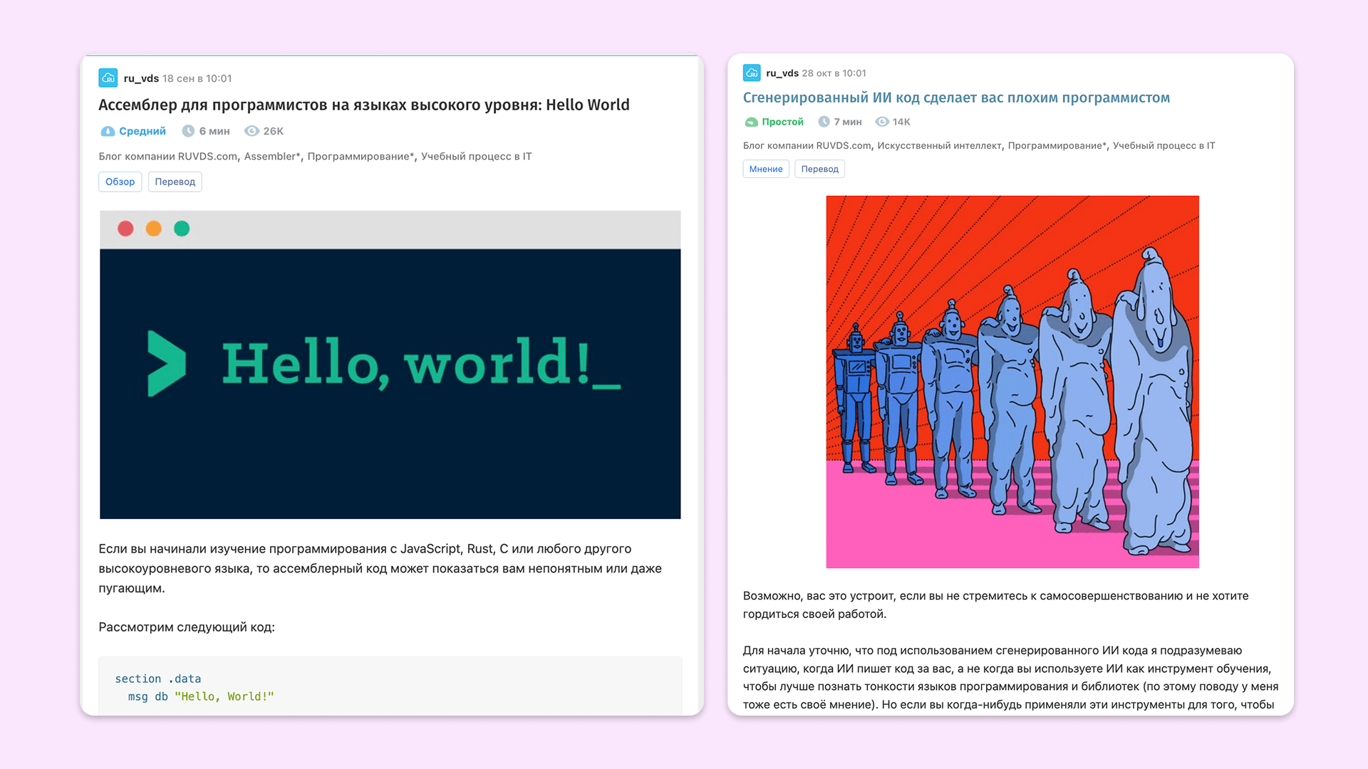 Крутой пример блога на «Хабре» — RUVDS. Компания сдаёт в аренду виртуальные сервера. Ребята рассказывают на портале о разных айтишных направлениях: от веба до ассемблера и кибербезопасности.