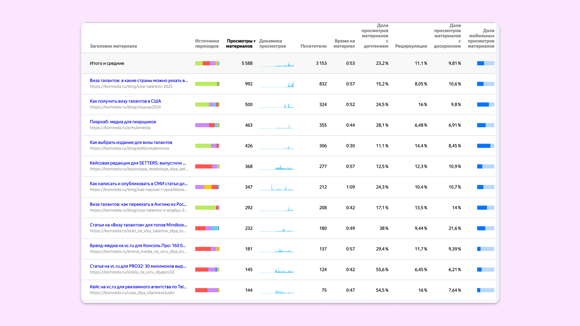 Например, мы публикуем в блоге КОМРЕДЫ SEO-статьи — так приводим трафик на нужные услуги. На сайт поставили «Метрику», чтобы детальнее анализировать аудиторию и её поведение. Смотрим, какие статьи генерят больше трафика, какие превращают читателей в лидов.