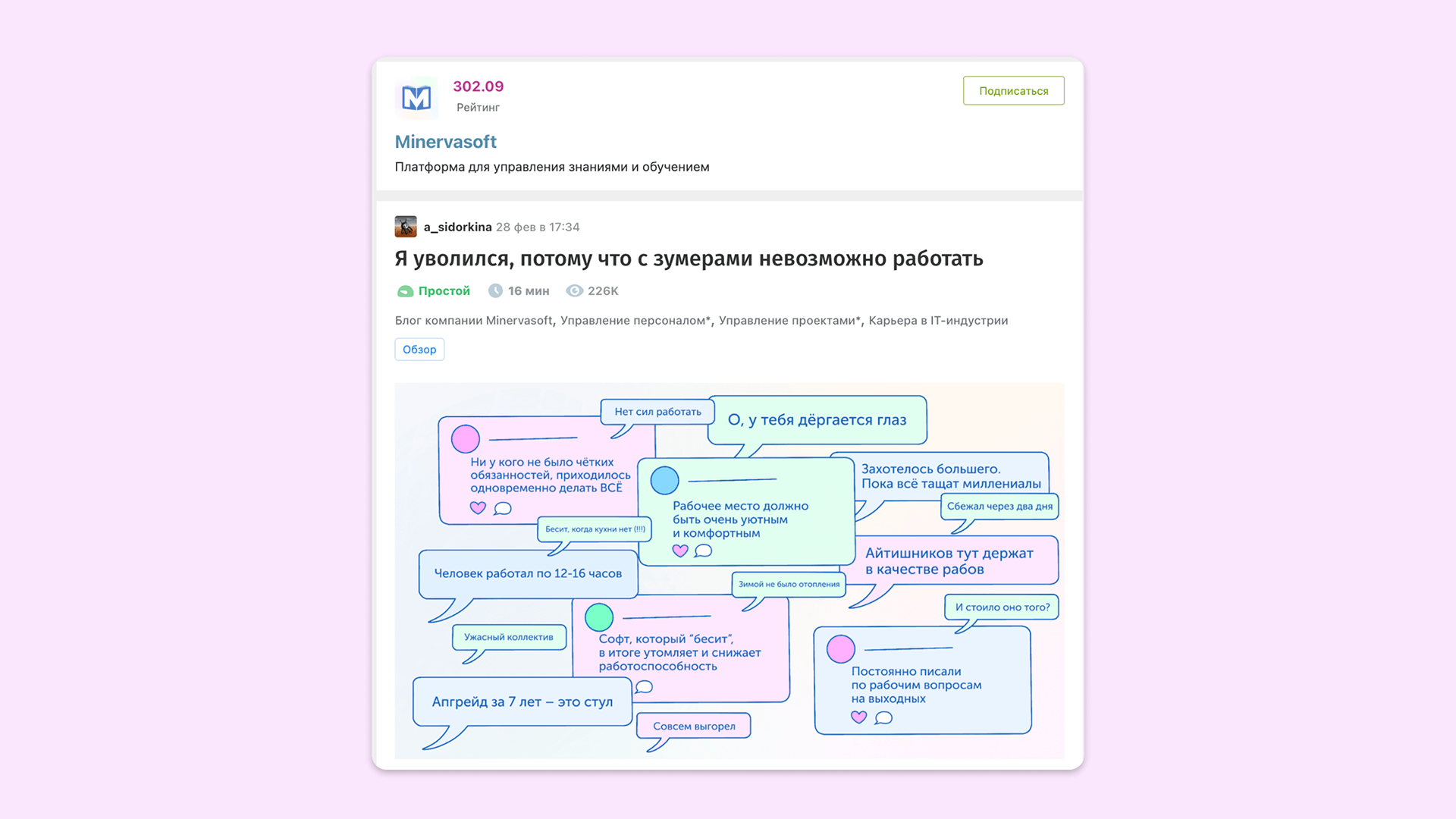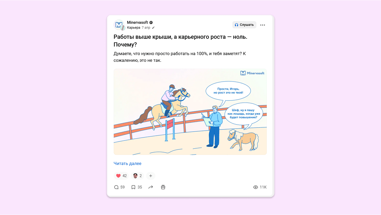 С блогом на vc.ru Minervasoft работает команда КОМРЕДЫ. Через статьи мы рассказываем о продукте и как он решает задачи бизнеса. Обсуждаем ИИ и привлекаем аудиторию живыми историями. Например, разбираем, почему карьерный рост напрямую не зависит от объемов труда. Материал на эту тему набрал 11 тысяч просмотров и 59 комментариев.