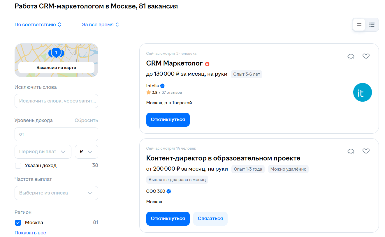 Найм CRM‑специалиста — это отдельный вызов. Рынок испытывает острый дефицит квалифицированных кадров. По данным на ноябрь 2025 года, в Москве было открыто лишь 81 вакансия CRM‑маркетолога против 1760 вакансий копирайтеров. Проблема в узкопрофильности и отсутствии вузовских программ. К тому же, без собственной экспертизы бизнесу крайне сложно корректно оценить навыки кандидата на собеседовании.
