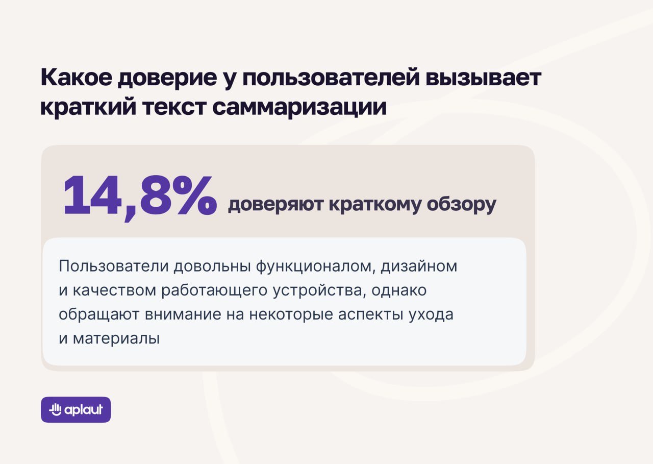 Исследование Aplaut показало — потребителей интересуют развёрнутые обзоры. Свыше 85% опрошенных считают, что короткие саммари не заслуживают доверия. По их мнению, резюме короткие, потому что в них не указаны недостатки товара или перечислены не все ключевые характеристики.