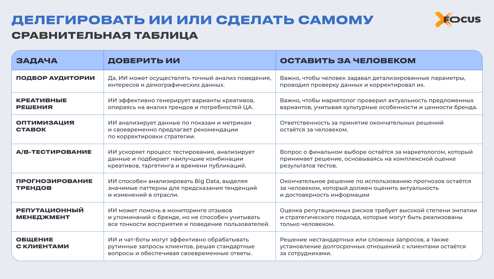 Где мы доверяем ИИ: подбор сегментов целевой аудитории на основе анализа Big Data.Где нужен контроль человека: окончательная настройка таргетинга, корректировка выборки в зависимости от текущих маркетинговых целей и стратегии бренда.