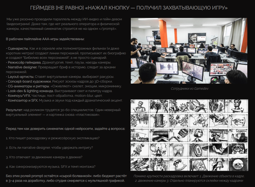 На самом деле, у нейро видео очень много общего с видеоиграми, только почему-то мало кто говорит, что над ними трудится такой же штат людей - более 30 профессионалов, включая режиссёров, драмаургов, диалоговых сценаристов, художников и т.п. и т.п. А ведь технология схожа по своей сути - ни там, ни здесь не используется живая камера.