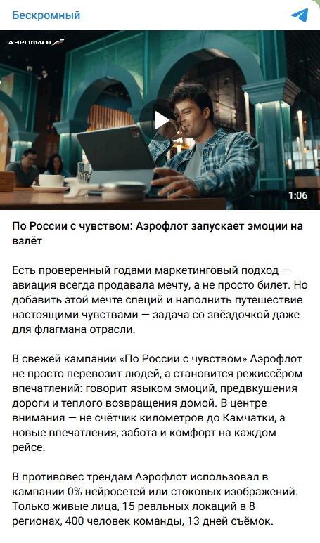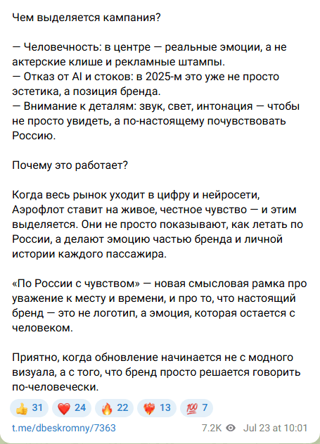 📌 Бренды с human-touch — всегда заметнее. И пока все гонятся за идеальностью нейросетей, ваши тени, голос, свет и смысл — выделят вас без лишнего шума. Например, Аэрофлот сейчас целенаправленно отказывается от всего, что связано со стоковыми видео и AI и фокусируется на живой эмоции и человечности.