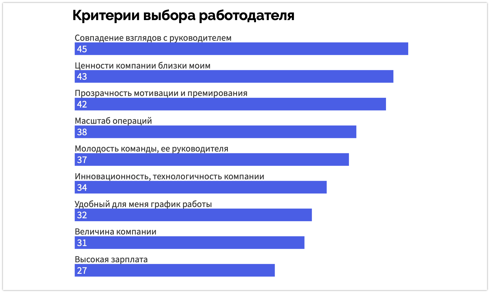 Мотиваторы соискателя тоже играют роль. Здесь для меня важно, чтобы цели и ценности человека совпадали как минимум с целями и ценностями компании, а в идеале — с моими, потому что нам вместе работать над одними и теми же задачами.