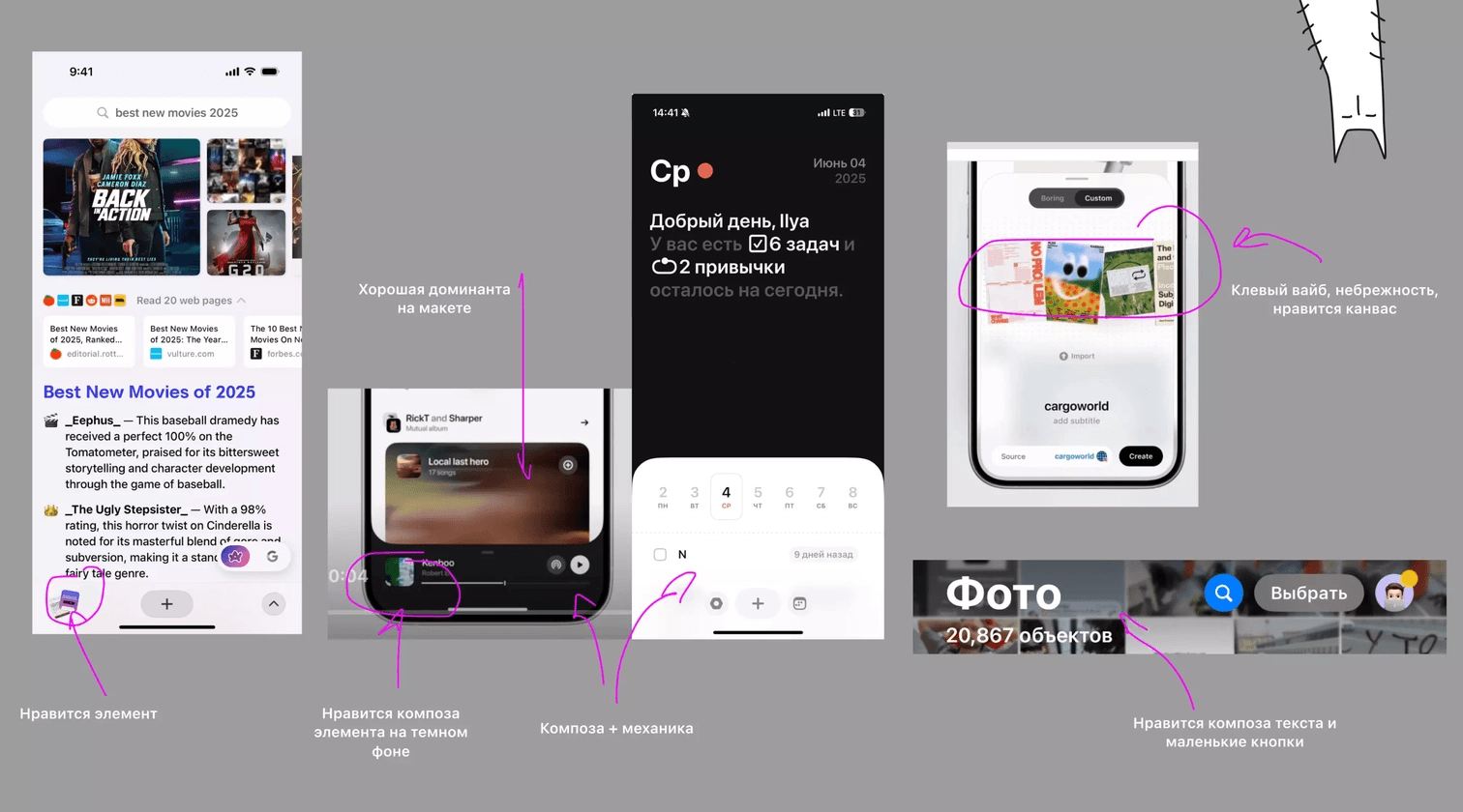 Здесь рекомендую пользоваться методом коллажирования: берёте референс, который вам нравится, и вставляете скриншот понравившегося блока. Прям тупо копируем чужой кусок — и из таких «огрызков» собираем свою композицию.