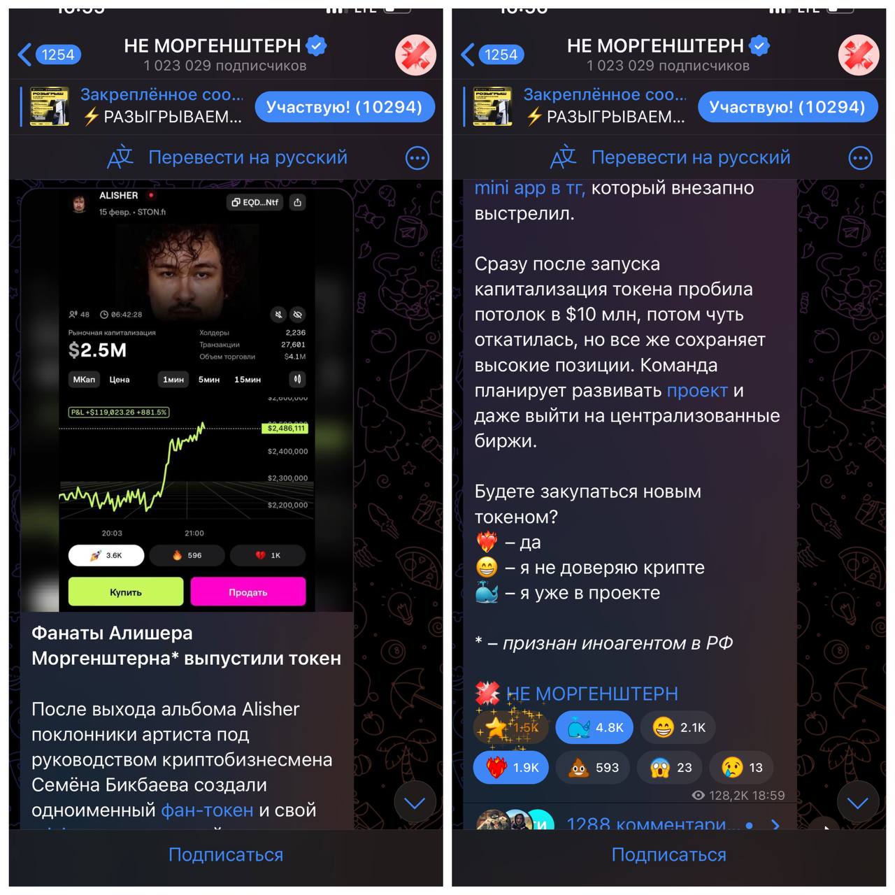 Фанаты Моргенштерна выбрали стратегически важные каналы для продвижения токена. Одним из ключевых стал Telegram-канал "Не Моргенштерн", где собрались более миллиона подписчиков. Этот выбор был обусловлен стремлением охватить уже существующую и вовлеченную аудиторией поклонников артиста, которые могли бы стать как подвижниками кампании, так и активными участниками токенизации.