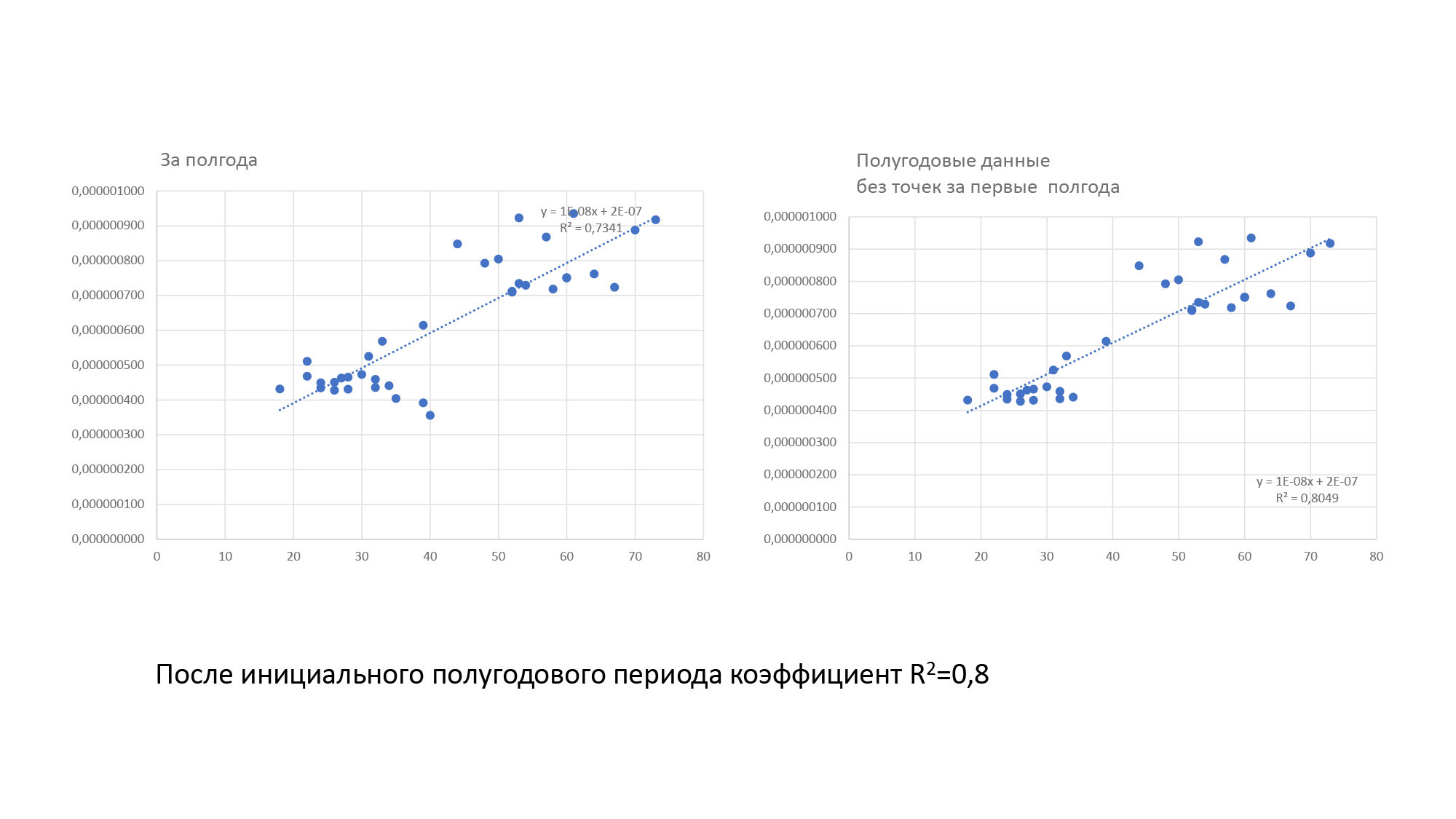 Однако, по мере того, как мы считаем, например, скользящую сумму по 3 и 4 месяцам (чтобы учесть эффект накопления событий), то он вырастает до 0,56. А, если мы убираем первые полгода, когда это только всё начиналось, то коэффициент корреляции становится равным 0,8049 (!).