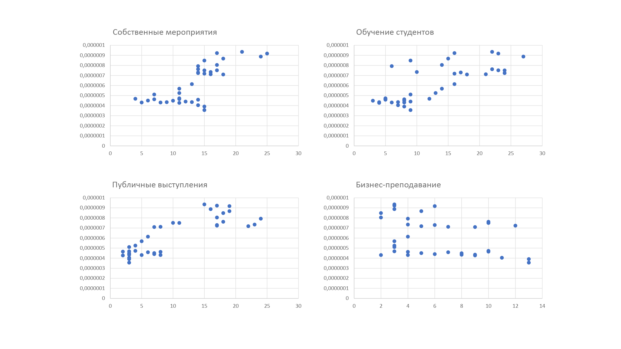 При этом, разные типы мероприятий по-разному влияют на знание бренда. Как видно из этих графиков — бизнес-преподавание, то есть обучение своих клиентов или тех, кто с нами уже работал — не влияют на этот показатель. Видно, что разброс более случайный, чем у остальных трех типов мероприятий.